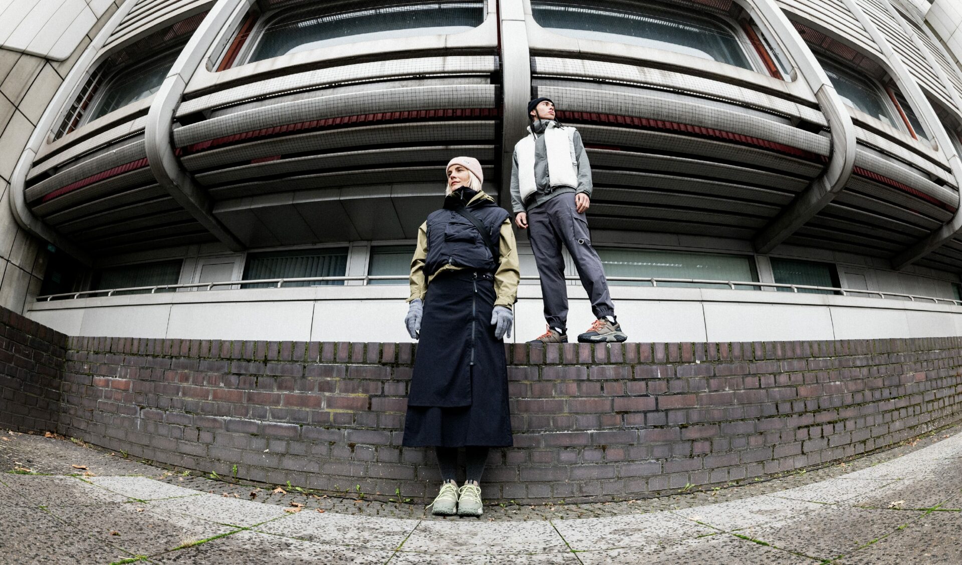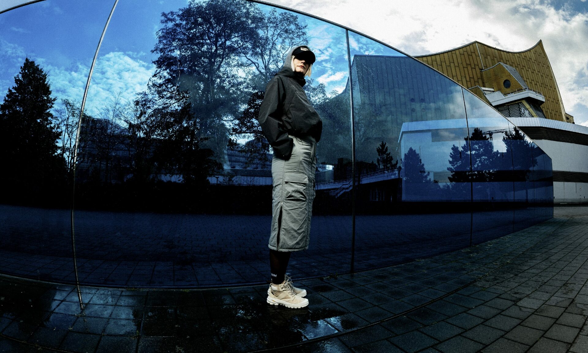 Bienvenue dans la zone la plus radicale du shooting : un quartier tellement géométrique qu’il ferait passer un architecte suisse pour un punk anarchiste. Ici, tout est ligne, répétition, volonté. Le décor idéal pour tester la dimension technique des vêtements. Je fais poser Lucie devant une façade en béton strié. Son manteau Palladium répond aux angles comme s’il en connaissait le langage. Je shoote en serré, puis en très large. Large, elle semble disparaître dans l’ampleur du décor. Serré, elle devient une extension de l’architecture. Berlin est une ville qui aime avaler les humains. Au moins, ils ont l’air d’être venus volontairement.