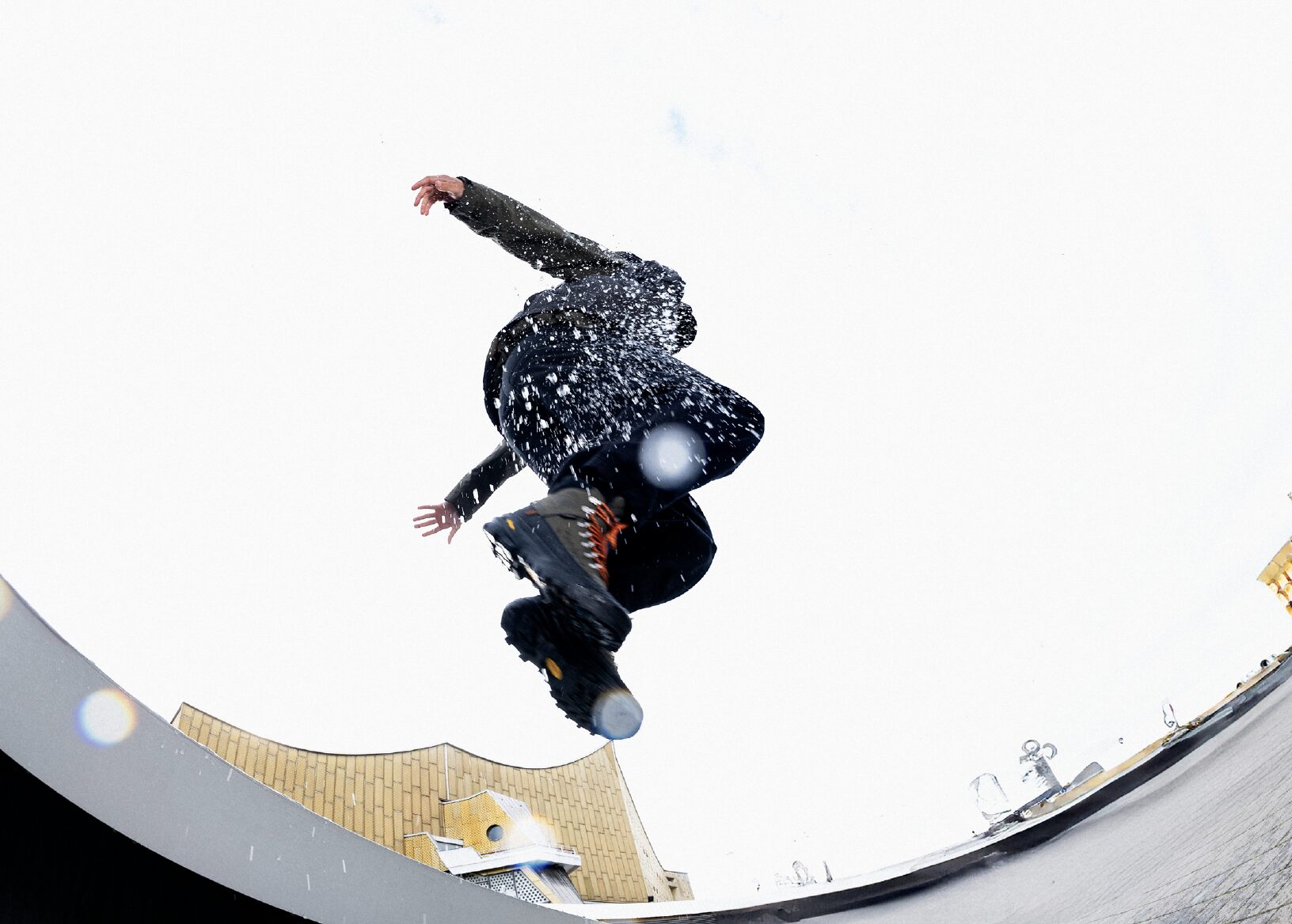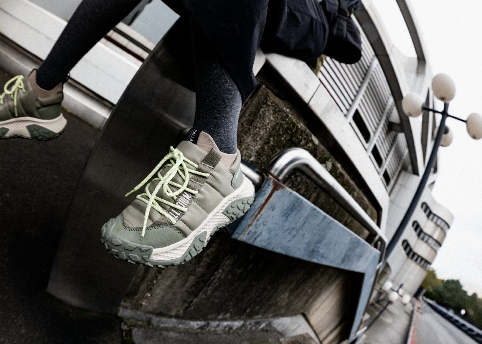 Si Berlin avait un nombril, ce serait Kottbusser Tor. La musique ? Le bruit de l’urbanisme qui se plaint. L’air ? Un mélange de currywurst, d’essence et de résignation heureuse. Le décor ? Des barres d’immeubles qui dominent la scène comme des parrains silencieux. Notre modèle porte des chaussures techniques : semelles épaisses, coupe tactique, silhouette fonctionnelle prête à survivre à une attaque de drones. Le GORPCORE, c’est ça : se préparer à l’apocalypse en étant très, très stylé. Je shoote au ras du sol. La chaussure dialogue avec le béton. On dirait une discussion entre deux blocs de matière qui se reconnaissent enfin.